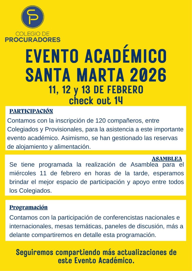 En este 2026 tendremos el Evento Académico 2026 en la ciudad de Santa Marta, donde concurrirán más de 120 participantes, contaremos con la participación de conferencistas nacionales e internacionales, mesas temáticas, paneles de discusión y espacios de reflexión institucional.