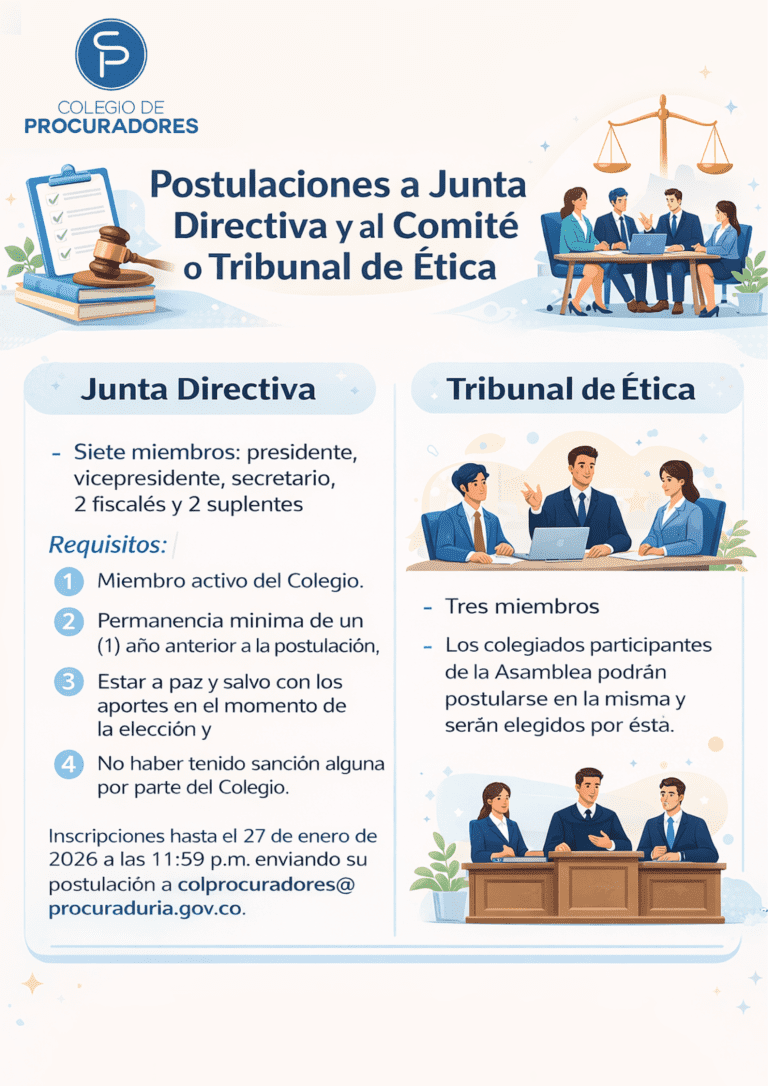 Fecha y forma: Las personas interesadas en conformar la Junta Directiva podrán inscribirse hasta las 11:59 p. m. del 27 de enero de 2026 (art. 28-1), haciendo su postulación en el buzón de correo colprocuradores@procuraduria.gov.co.
